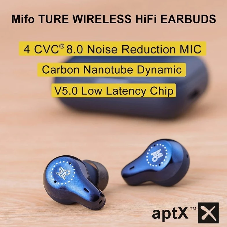 The Mifo O7 are the most advanced true wireless earbuds in the world. The O7 improves on the award-winning Mifo O5 with carbon nanotube dynamic speaker drivers in each earbud for incredibly accurate and big sound at all frequencies, haptic touch controls, active noise canceling, and the latest Bluetooth 5 chipset from Qualcomm.